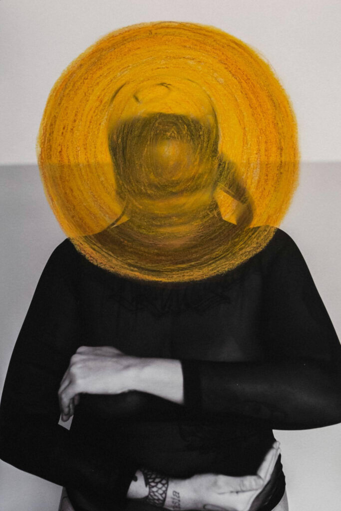 Black and white digital photography printed on Canson Infinity Rag Photographique 310 g/m² paper, with hand-applied interventions using oil pastel in earthy tones; self-portrait.