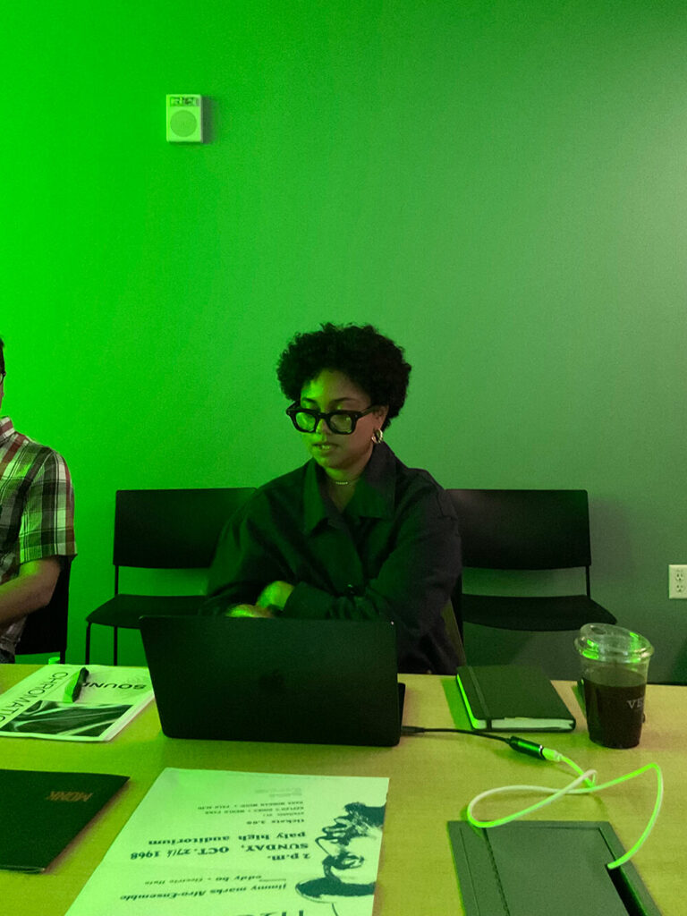 She has curated film programming for the Coolidge Corner Theater and the Anderson Collection at Stanford, and currently co-chairs a graduate-run film screening series. Her work is influenced by thinkers such as composer and sound artist Pauline Oliveros—particularly the concepts of “the sonosphere” and “deep listening”—and artist Jennie C. Jones, who explores the relationship between sound and architecture with an ear toward Black aural poetics.